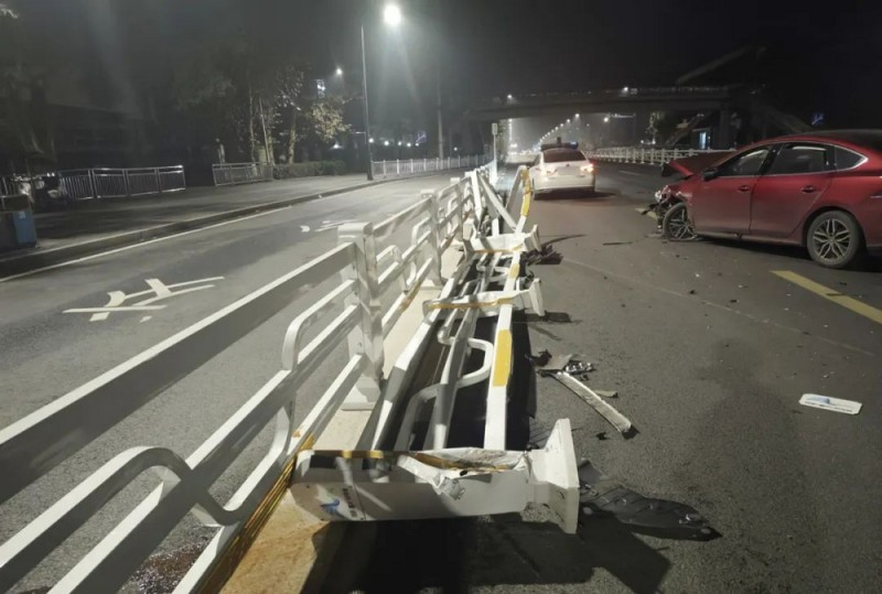 到达现场后,只见一辆受损严重的红色小型轿车停在马路边,车辆安全气囊已全部弹开,车头已经变形受损。事发道路中央隔离栏也被撞坏,肇事驾驶员正在路边焦急等待救援。